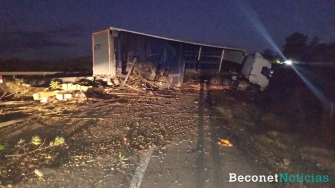 Un camión tráiler se ha salido de la carretera en la curva situada justo después del puente de Montoro, provocando el bloqueo total del carril de aceleración que da acceso a la autovía en dirección Villa del Río. El siniestro tuvo lugar en la noche de este martes y dejó la zona llena de restos de carga y piezas del vehículo.