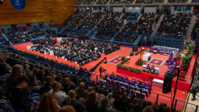 La ceremonia se celebró en el Palacio de Deportes Carolina Marín, un espacio habilitado por su gran capacidad ante la elevada afluencia de asistentes. Hasta allí se desplazaron familiares de las víctimas, vecinos llegados desde distintos puntos de la provincia de Córdoba —especialmente del entorno de Adamuz—, así como representantes institucionales y eclesiásticos.