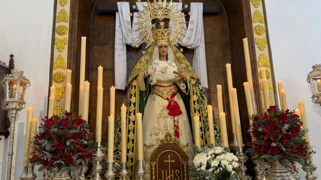 Nuestra Señora de la Alegría: Una de sus primeras obras de gloria (1942), que hoy procesiona desde la "Catedral de la Campiña" .