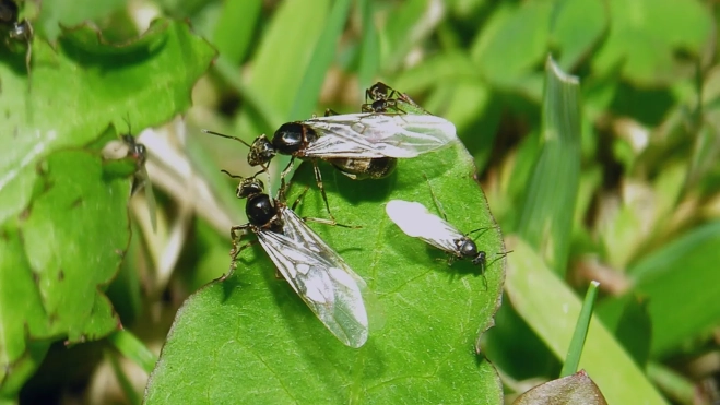 Si observas con atención, verás que hay dos tamaños de hormigas voladoras. Las más grandes son las hembras (futuras reinas) y las más pequeñas son los machos.